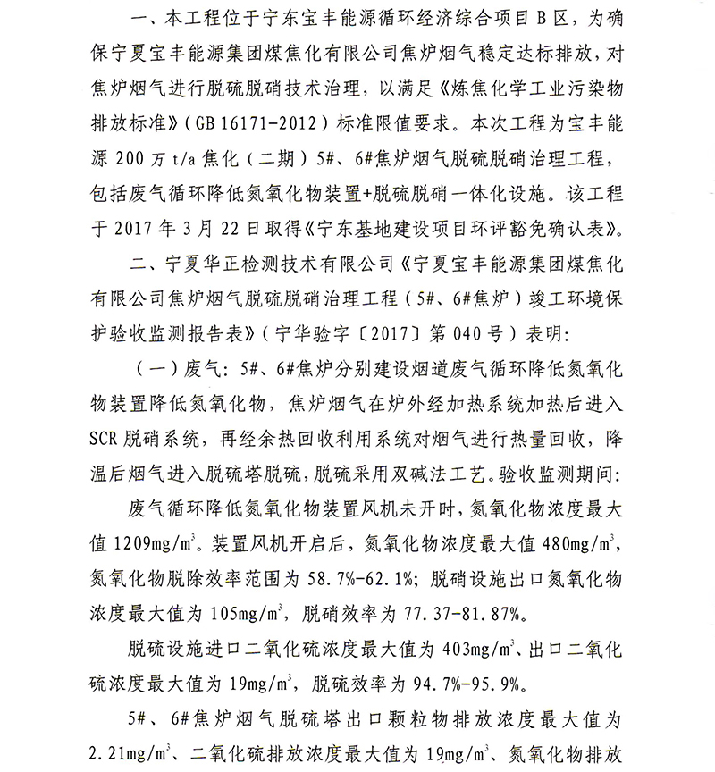 关于宁夏宝丰能源集团煤焦化有限公司焦炉烟气脱硫脱硝治理工程(5# 6#焦炉)验收